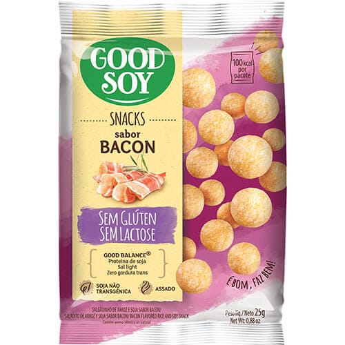 Farinha de arroz, farinha integral de soja não transgênica, óleo vegetal (palma, soja), condimento preparado sabor bacon, sal light e corante urucum. NÃO CONTÉM GLÚTEN. ALÉRGICOS: CONTÉM DERIVADOS DE SOJA.